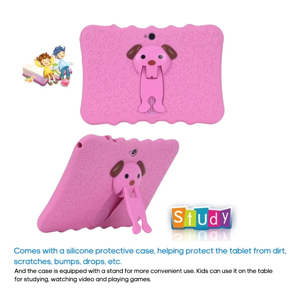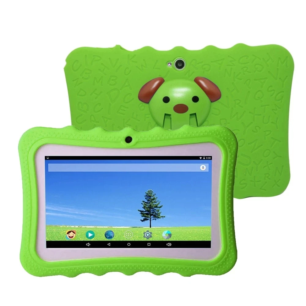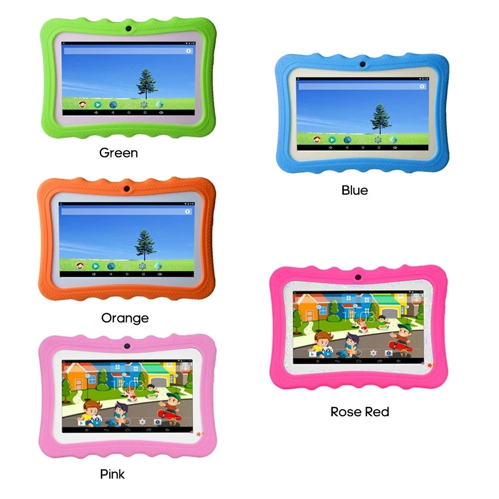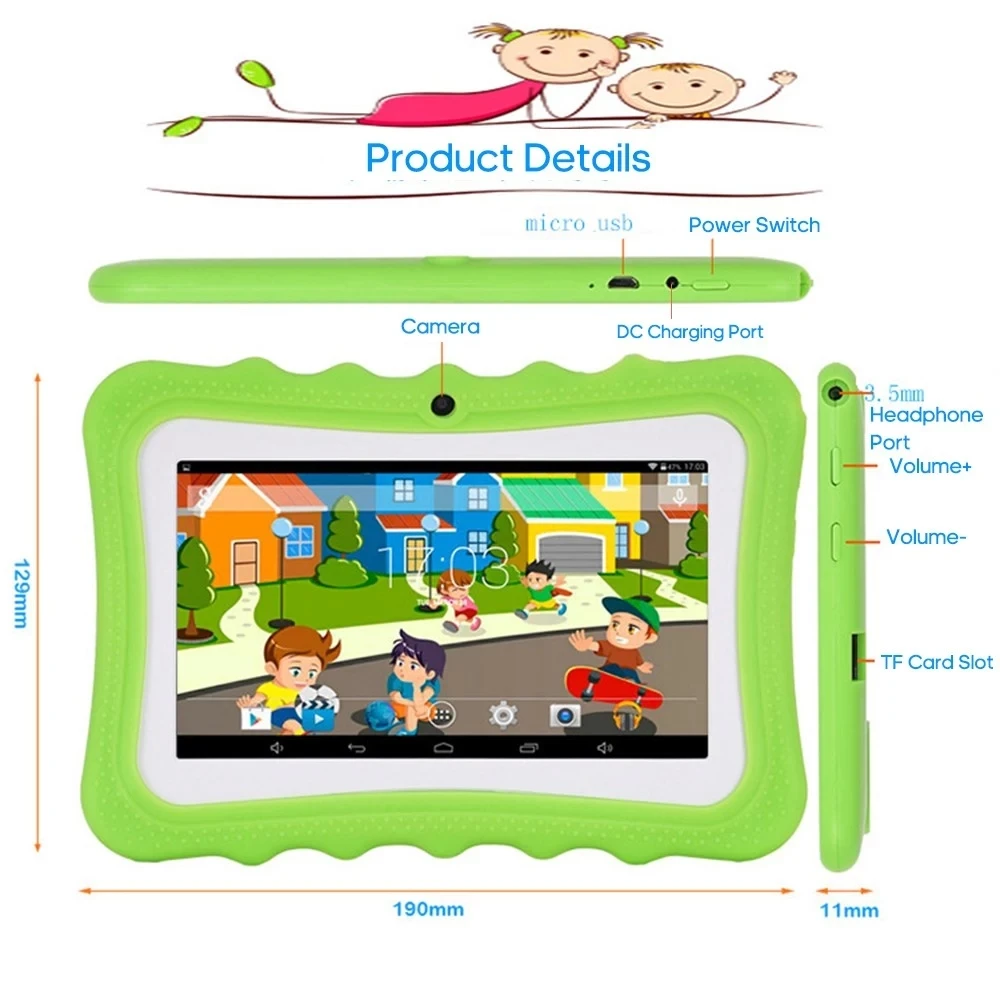 Features:7 inch large display screen with 0.3MP front and 2.0MP rear dual cameras.Compatible with Android 4.4 operating system with quad core processor, support Wi-Fi and BT connection.Equipped with Micro USB port, TF card slot and 3.5mm headphone port for more convenient use.The 7 inch tablet with TF card slot for up to 64GB of expandable storage, which allows kids download videos, musics, games, etc. Made of high-grade material to ensure its durability and security. Comes with a shock-proof and dust-proof silicon case, and the case is equipped with a stand for more convenient use on desk.A perfect gift for your children.Specifications:Color: Green, Blue, Orange, Rose Red, Pink (Optional)Plug Type(Power Adapter): 3 Types (Optional)Screen Size: 7 Inch DisplayResolution: 1024*600Camera: 0.3MP (Front), 2.0MP (Rear)Operating System: Compatible with Android 4.4Processor: Quad-CoreRAM: 512MBInternal Memory: 8GBMaximum Expandable Memory(TF Card): 64GB (TF card is not included)Batterys: Built-in 3000mAh Polymer Lithium BatterysItem Size: 190 * 129 * 11mm / 7.48 * 5.08 * 0.43inPackage Size: 220 * 150 * 64mm / 8.66 * 5.91 * 2.52inPackage Weight: 600g / 1.32lbNotes:1. For Power Adapter, there are different plug types to choose from, please choose the one that is applicable in your country.2. Due to the different monitors and light effects, the actual color of the product maybe slightly different from the picture color, thank you for your understanding.Package List:1 * Tablet 1 * Power Adapter1 * USB Cable1 * Micro USB Cable1 * Silicone Protective Case1 * User Manual