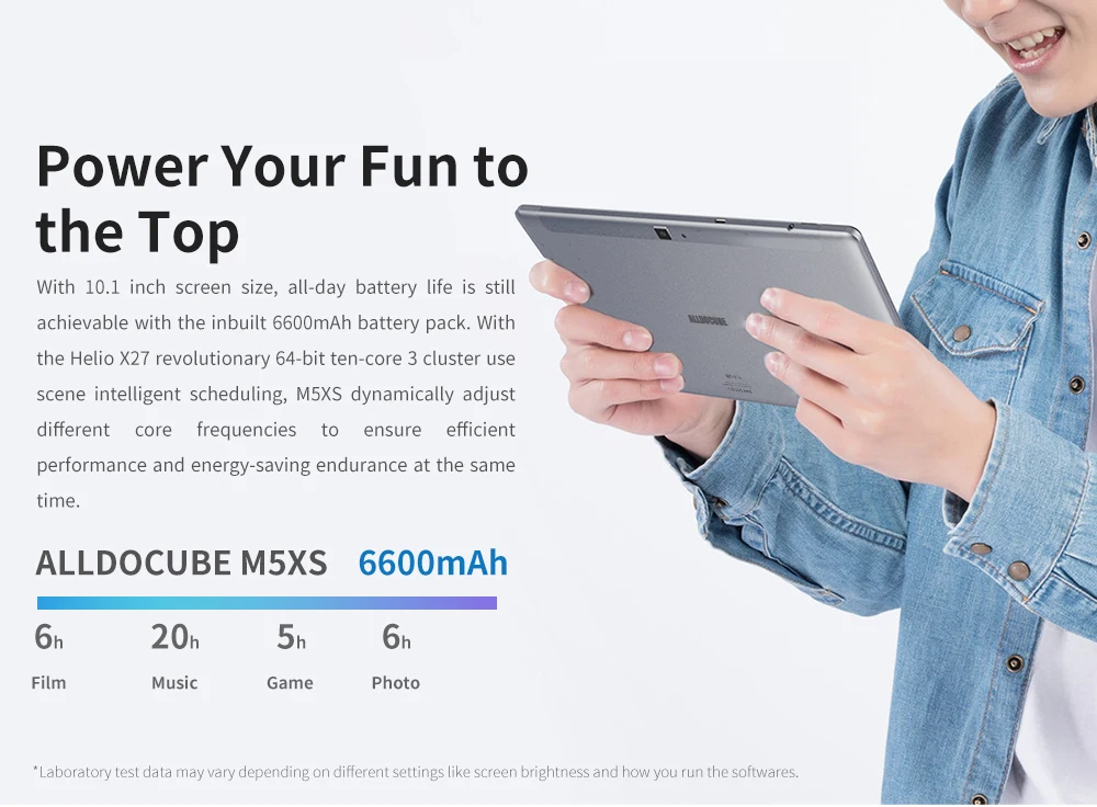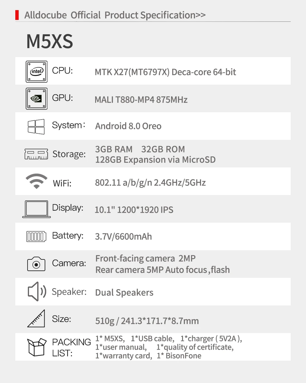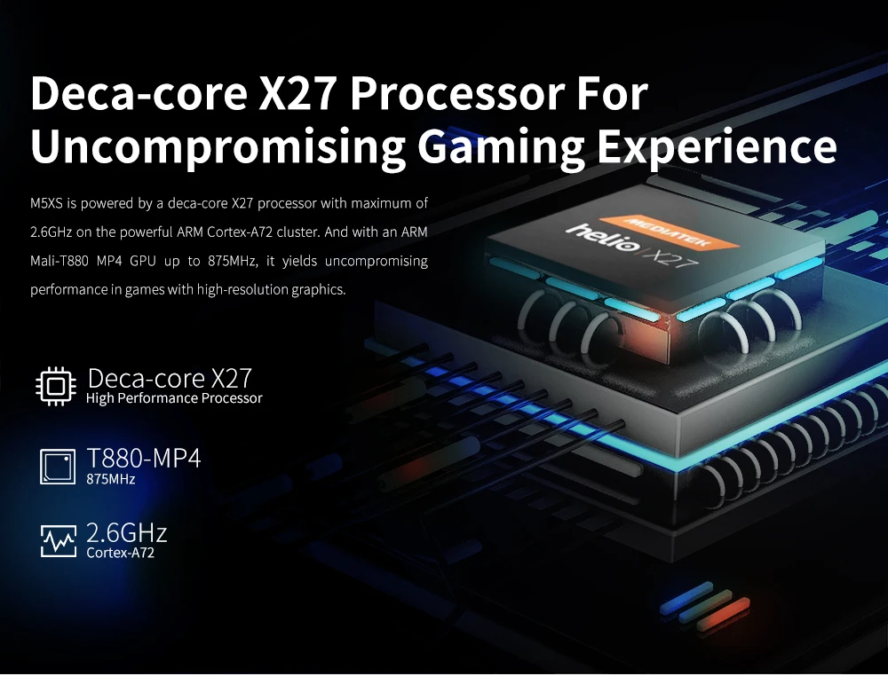 ALLDOCUBE M5XS 10.1 inch IPS Screen MTK X27 Deca Core 3GB RAM 32GB ROM Android 8.0 Phone Tablets Wifi BT4.2Deca-core X27 Processor For Uncompromising Gaming ExperienceM5XS is powered by a deca-core X27 processor with maximum of 2.6GHz on the powerful ARM Cortex-A72 cluster. And with an ARM Mali-T880 MP4 GPU up to 875MHz, it yields uncompromising performance in games with high-resolution graphics.