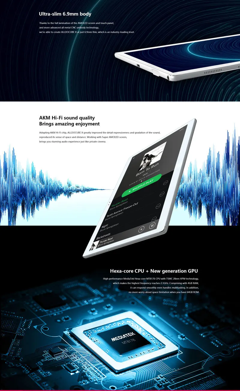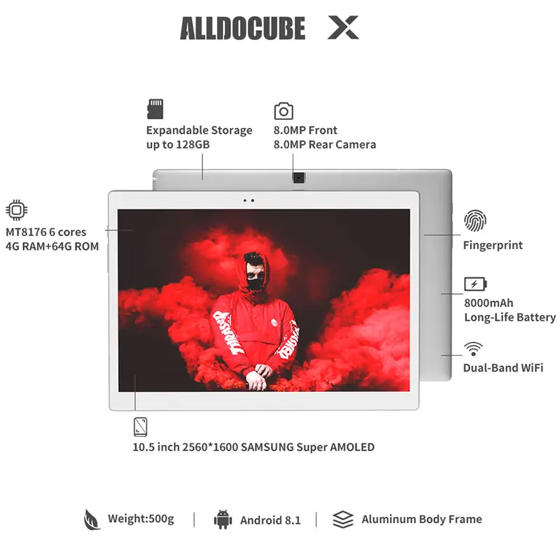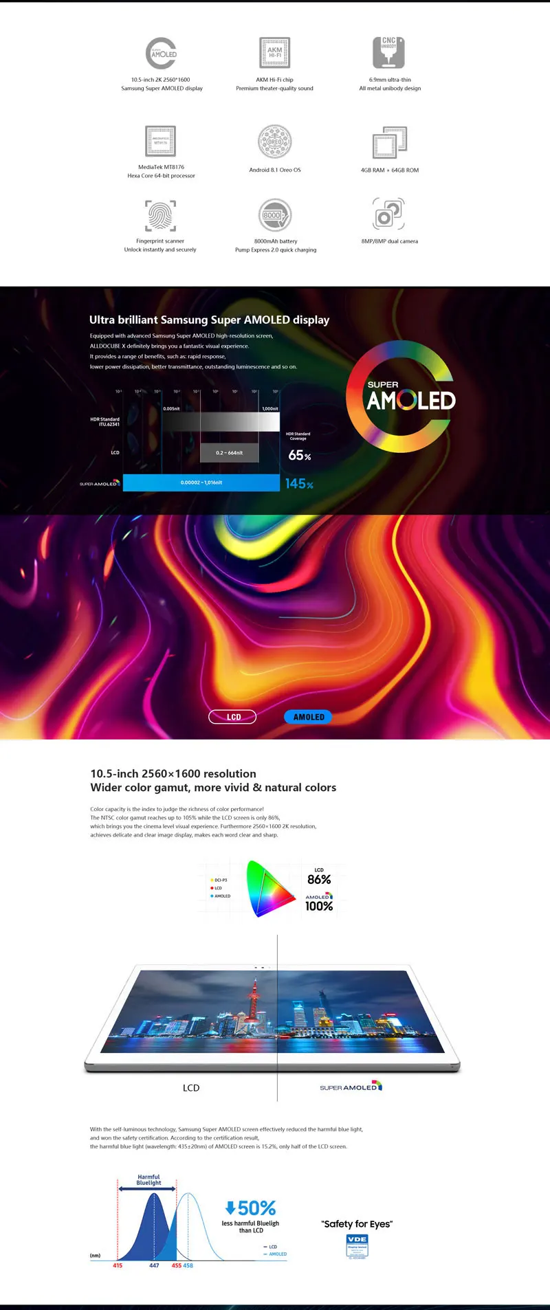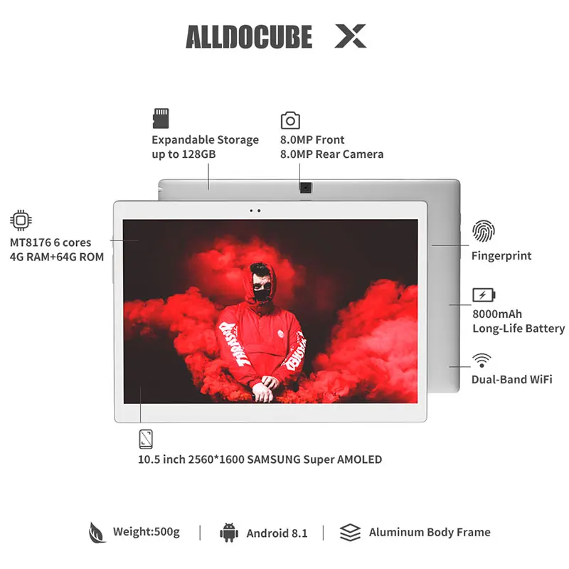 Tablet Designed for Movie & MusicUltra brilliant SamsungSuper AMOLED displayEquipped with advanced Samsung Super AMOLED high-resolution screen, ALLDOCUBE X definitely brings you a fantastic visual experience. It provides a range of benefits, such as: rapid response, lower power dissipation, better transmittance, outstanding luminescence and so on.10.5-inch 2560times1600resolution Wider color gamut,more vivid & natural colors