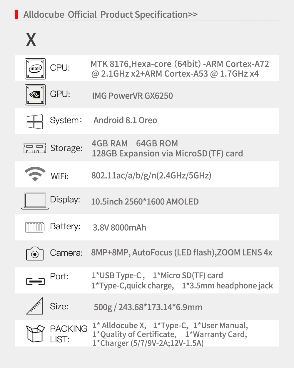 1* Alldocube X, 1*Type-C, 1*Charger (5/7/9V-2A;12V-1.5A)1*User Manual, 1*Warranty Card,1*Quality Of Certificate
