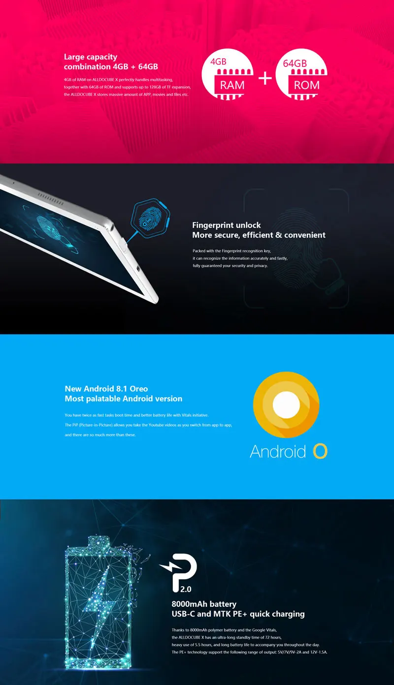 Main Features:● Android 8.1 OSOffers more powerful performance, brings you more smooth and wonderful user experience● MTK 8176 Hexa Core 1.7GHz, up to 2.1GHzUltra-low-voltage platform and Hexa Core processing provide maximum high-efficiency power● IMG PowerVR GX6250 GPUOn-processor graphics with shared video memory provide high image quality for Internet use, basic photo editing and casual gaming● 10.5 inch 2560 x 1600 Resolution Touch AMOLED ScreenOffers good experience for watching videos and browsing the Web● 4GB RAM for Advanced MultitaskingSubstantial high-bandwidth RAM to smoothly run your games, photos and video-editing applications● 64GB eMMC Storage CapacityProvides room to store pictures, videos, music and more● Dual 8.0MP Camera for Photos and Face-to-face ChatAllow you to capture memorable moments or chat with friends● Induction SystemLight Sensor, G-sensor, OTG, Fingerprint Sensor