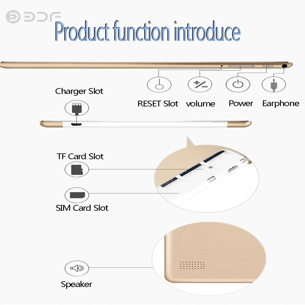 Basic Information: * Tablet PC Brand: BDF* Screen Size: 10.1inch* ROM: 3G+32GB* Resolution: 1280*800 IPS* Operating System: Android 7.0* CPU Processor: MTK6753* Standard Battery Capacity: 5000mAhNetworks and Wireless: * WiFi: Support WiFi (Built-in 802.11b/g/n WLAN Card)* 3G: Built-in, Support 3G calling, WCDMA 850/2100MHz* 2G: Support 2G calling, GSM 850/900/1800/1900MHz* SIM Card: Support* Bluetooth: Support* GPS: SupportAdditional Features: * Camera: Front Camera 2.0MP; Rear Camera 5.0MP* Input/Output Ports: - 3.5mm Audio Out Port*1;- Micro USB port*1; - Micro TF Card Slot*1;- SIM Card Slot*2* OTG: Yes* Output Device: Built-in Loud speakers* Input Device: Built-in Microphone* Play Store: Yes, Built in* Android Market: Yes, You can download thousands of APPS from the Google Android Market* Adobe Flash: Support* Languages: Afrikaans, Bahasa Indonesia, Bahasa Melayu, Dansk, German, English, Spanish, Filipino, French, Italian, Magyar, Dutch, Portugues (Brasil), Portugues (Portugal), Vietnamese, Turkish, Greek, Russian, Arab, Thai, Korean, Chinese(trad), Japanese etcPackage Includes:* 1 piece Tablet PC* 1 piece Standard Charger* 1 piece USB Cable* 1 English User Manual