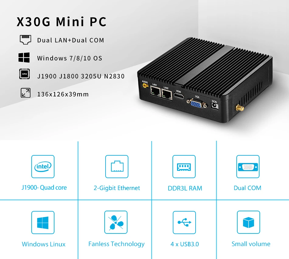 | Mini PC Celeron J1900 Quad-Core Dual LAN 2*COM Fanless Mini Computer Celeron N2830 J1800 Windows 10 NetTop 300M WIFI HDMI VGA |