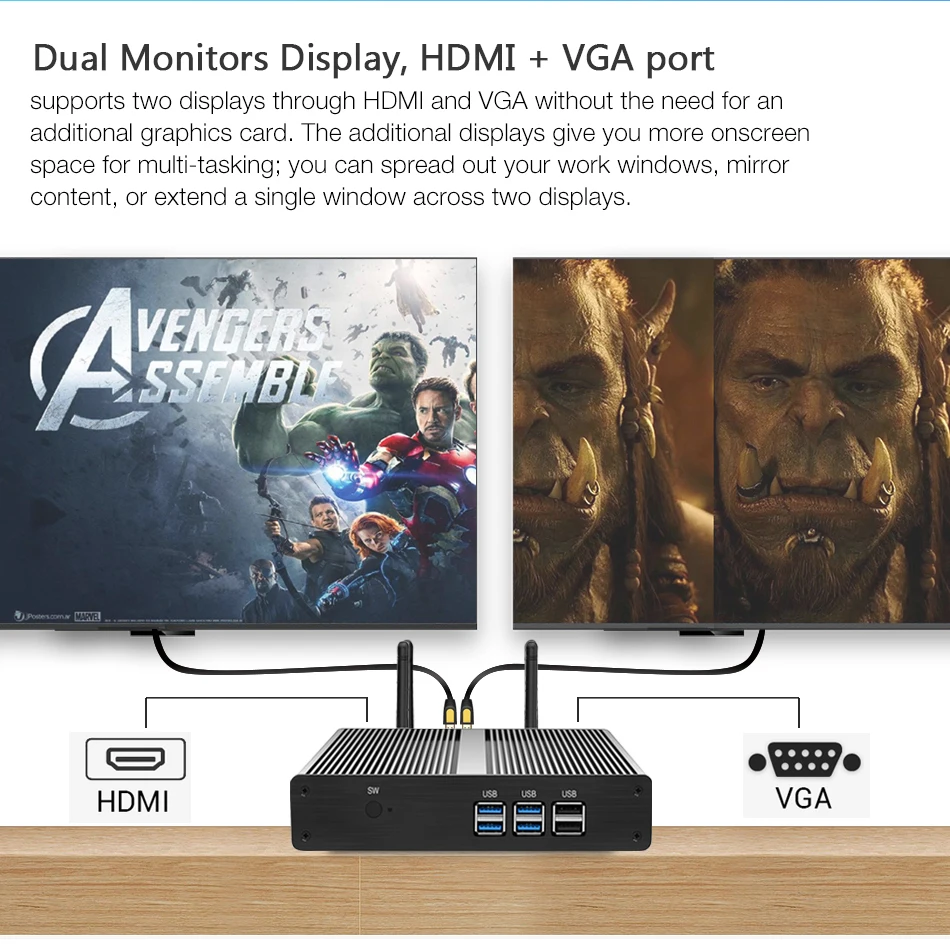 1. Support Windows 10/8, Linux, Ubuntu, Openelec etc.2. Removable memory and storage for added flexibility, 1xDDR3L RAM, 1xmSATA SSD, 2.5'' HDD SATA support installation.3. Ultra-compact mini PC masuring 173x124x36mm and lightweight only 0.8kg.4. On-board silent Fanless with aluminium heatsink, support 7x24 hours working operation.5. Low power consumption, energy-saving up to 85% compare to traditional desktop PC.6. With HDMI, VGA, 4 x USB 3.0 + 2 x USB2.0, 1 x 1000Mbps LAN, 1*MIC SPK7. Mini PCIe Wireless Wifi (300M 802.11.b/g/n) support installationTips for Buyer :