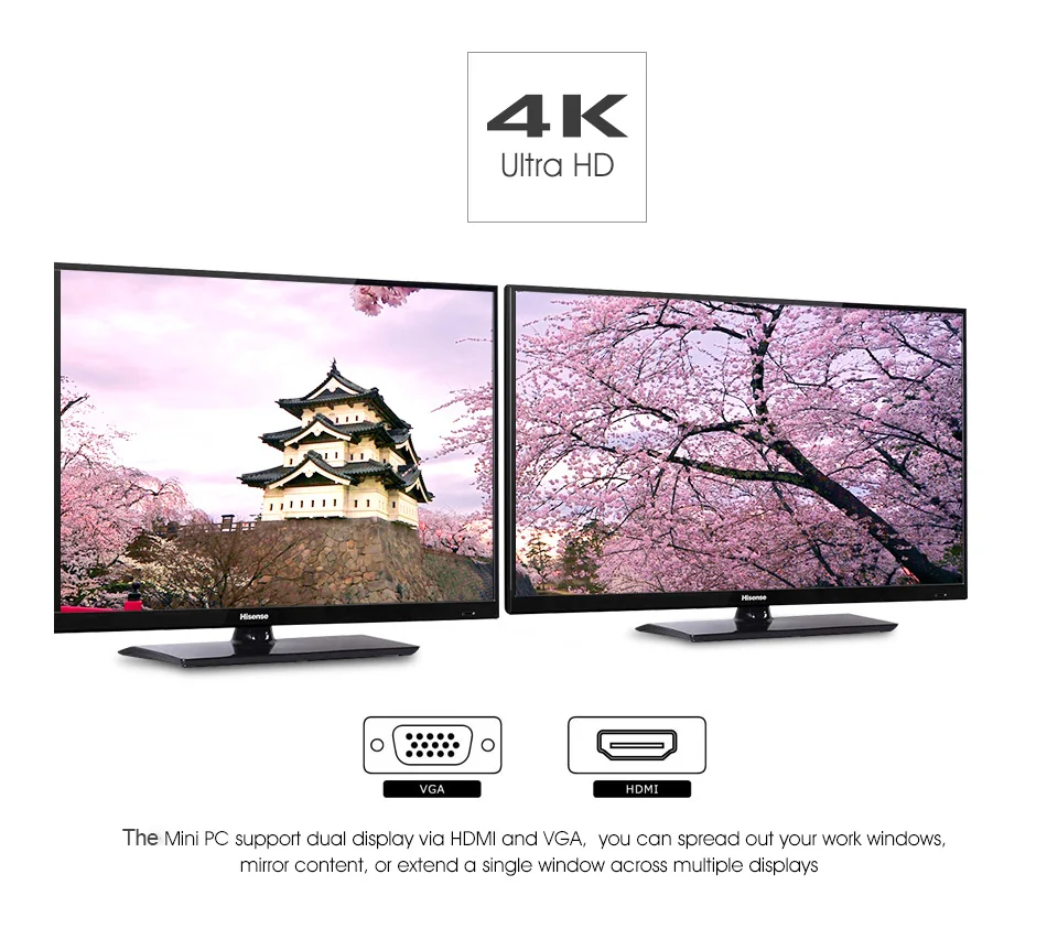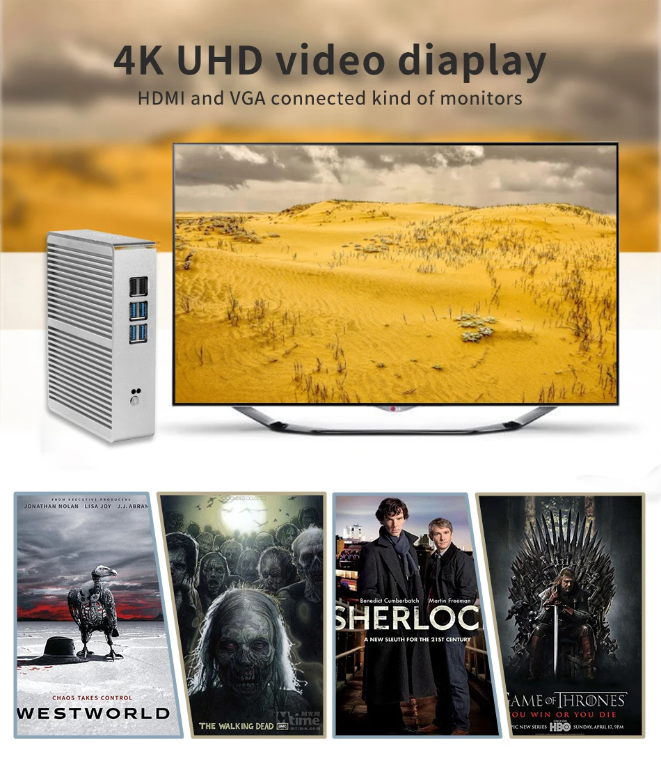 Features:① OS support Windows 7, Windows 8 & 8.1, Windows 10, Linux, Ubuntu ; ( 3965U/3955U don't support Windows 7 )② Compatible with 1x DDR3L 1.35V memory, max support 8GB;③ Support dual storage, a combination of one mSATA SSD and one 2.5 inch HDD/SSD;④ Includes 4x USB3.0, 2x USB2.0, 1x HDMI, 1x VGA, 1x MIC, 1x SPK, 1x RJ45 Gigabit Ethenet;⑤ Support WiFi connect to network;⑥ Fanless passive cooling, offering you zero noise experience;⑦ Ultra compact and working space saving, Support VESA-mounted to the back of monitor, free send VESA mount4K UHD Video Display