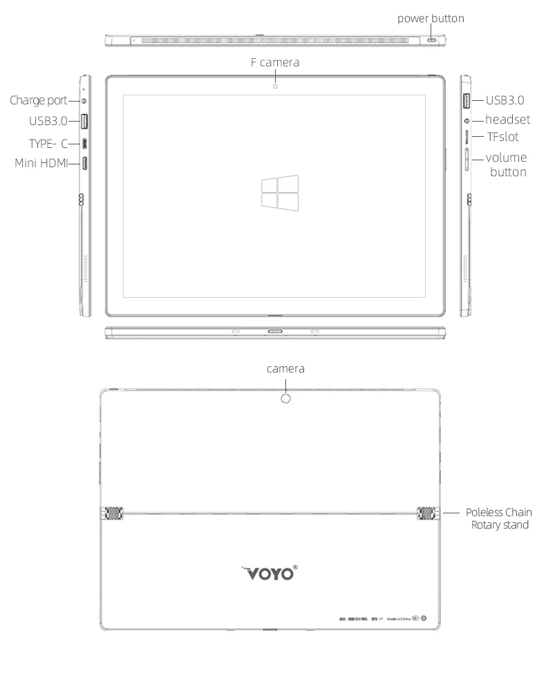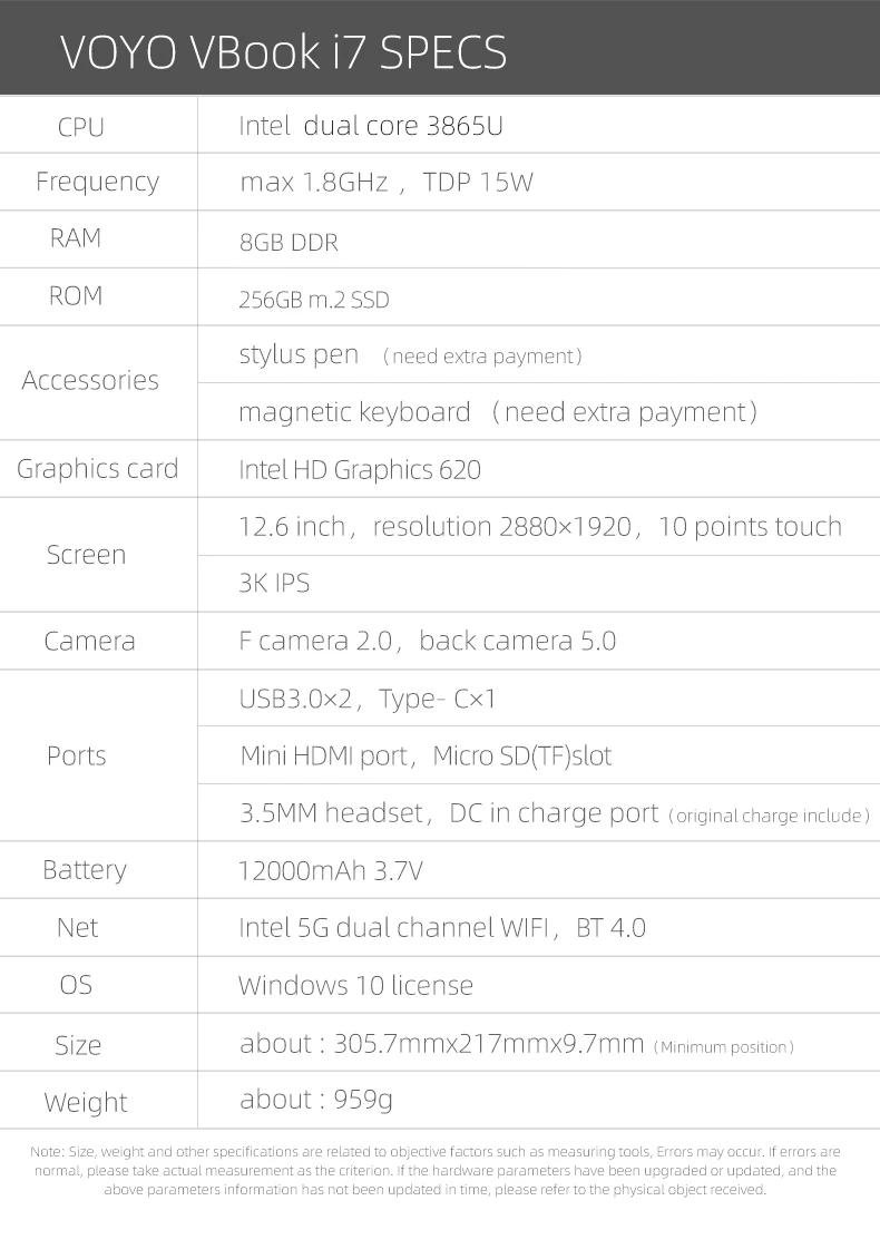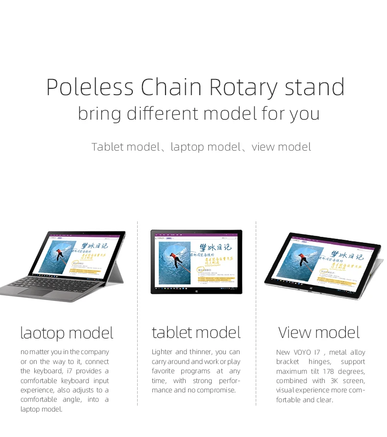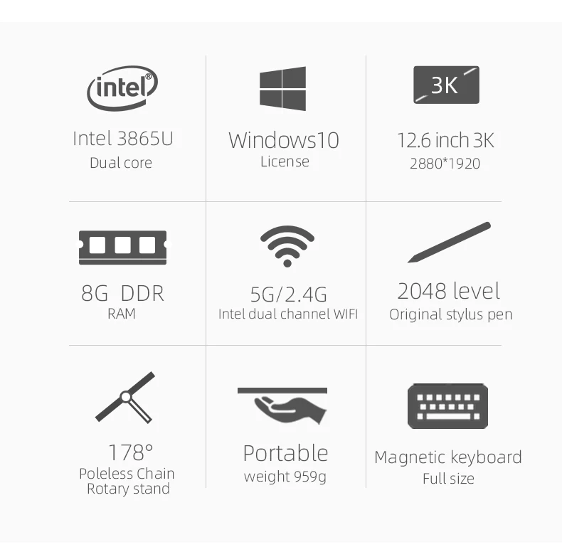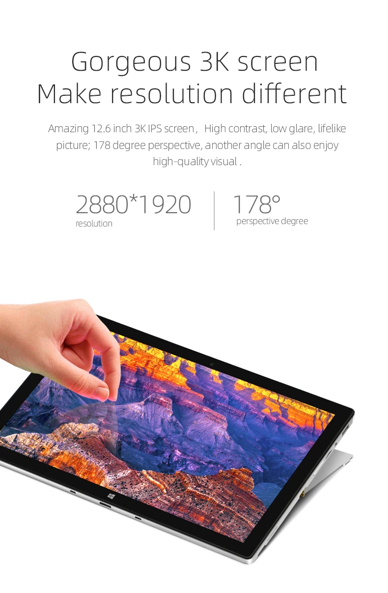 Features:Screen: 12.6inch,resolution 2880*1920,10 points 3k OGSCPU:Intel 7th Core i7-7600UFrequency: 2.8GHz,Turo(3.9Ghz) TDP 15WRAM: Dual Channel 8GB DDR or 16GB DDRROM: 256GB m.2 SSD or 512G m.2 SSDCamera: F2.0M/5.0MOS: Windows 10 licensePorts:USB 3.0*2,Type-C*1,Mini HDMI,Micro SD slot,3.5MM headset,DC in charger