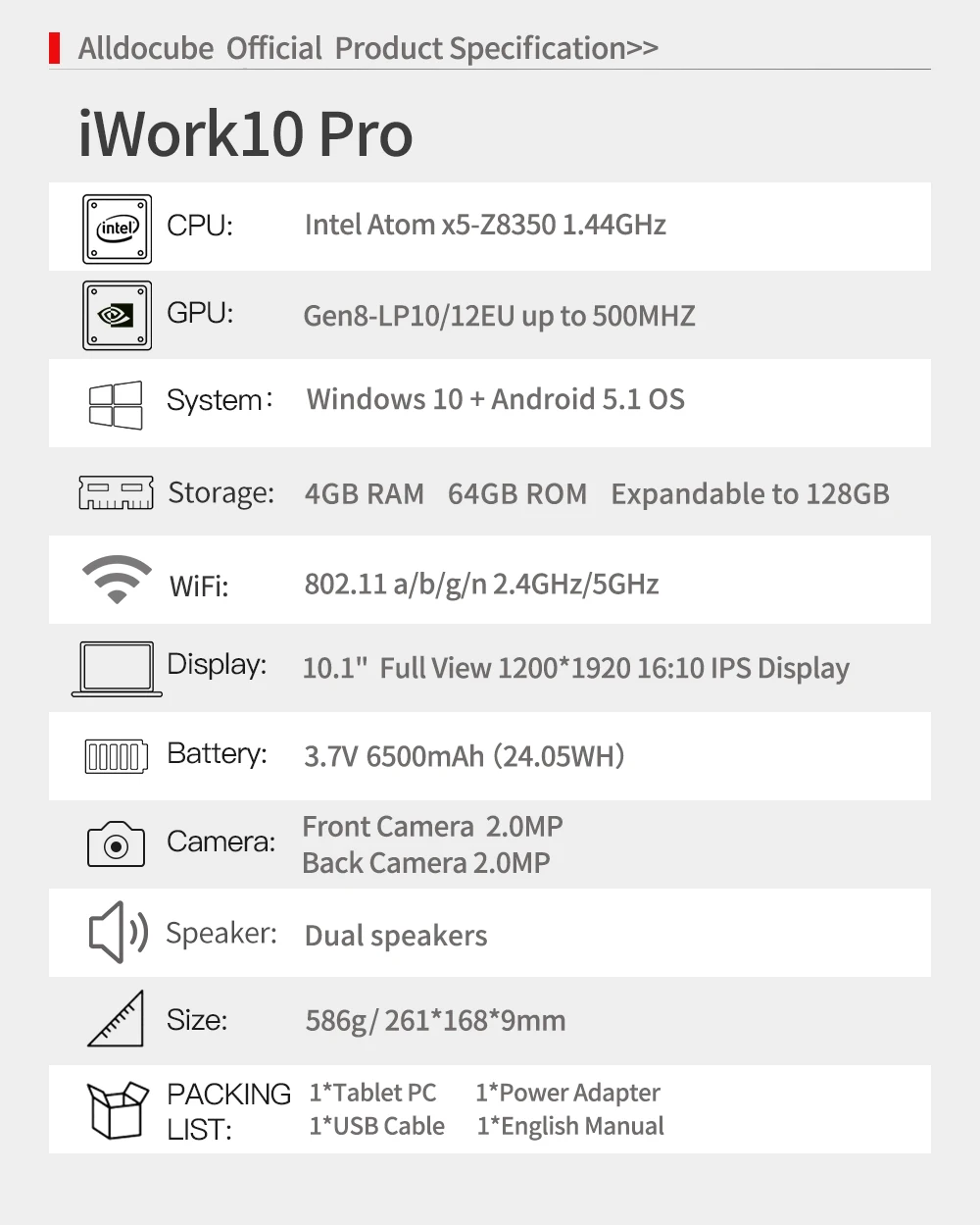 Brand: ALLDOCUBE Type: 2 in 1 Tablet OS: Windows 10 + Android 5.1 CPU Brand: Intel CPU: Intel Cherry Trail x5-Z8350 Core: 1.44GHz,Quad Core GPU: Gen8-LP/12EU