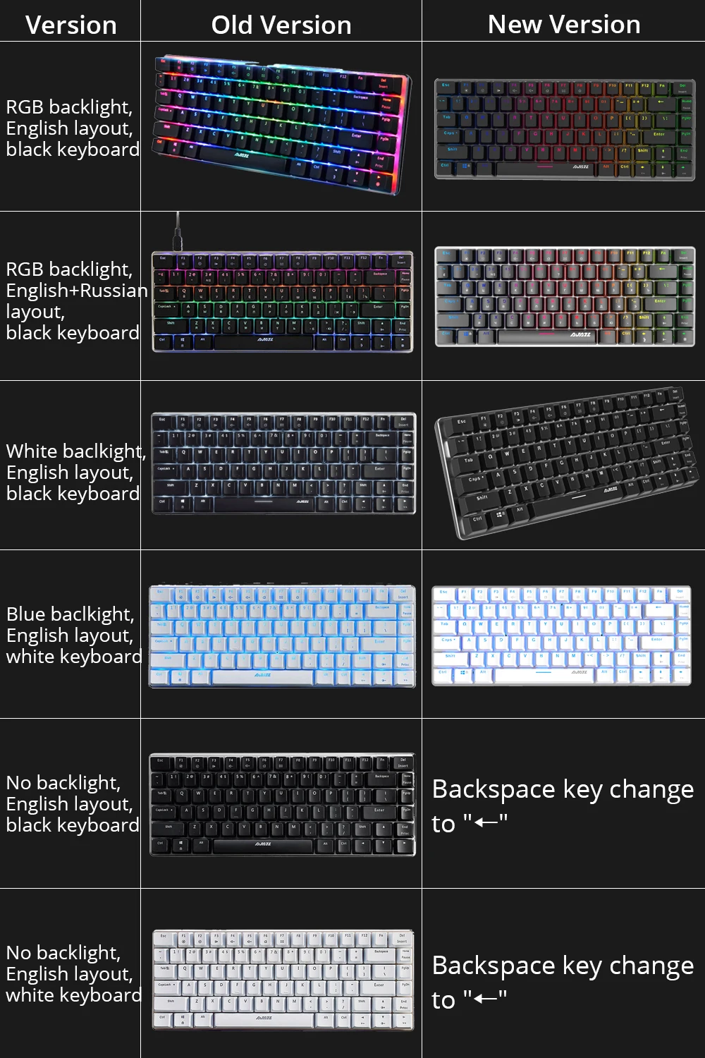 1. The new version uses the Two-color injection keycap, and the letters on the keycaps are permanently no faded.2. Change the Backspace key to "←".3. RGB Russian layout version, Russian letters are no backlit.