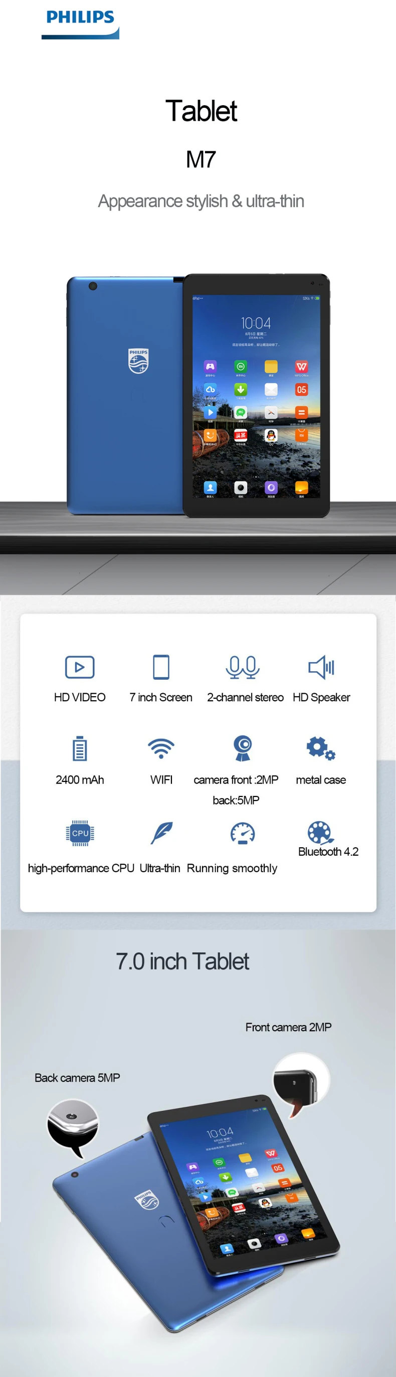 Brand: Philips Model NO.: M7CPU: 4G Chip,ARM-A7, 1.3 GHZ OS: Android 8.1RAM: 2GBROM: 16GBSD External: 128GBResolution: 1200*1920 FHD / 1280*800 HDBattery: 2400 mAh Build-in BatteryScreen: 7 inch IPS,1024*600,Multi TouchWIFI: YesBluetooth: YesI/O ports: Type-C USB,2.0 SpeedCamera: "Front 2MP Back 5MP" Language: English. ChineseColor: Grey / Blue/ SilverSize: 192*11.8*8.2mm